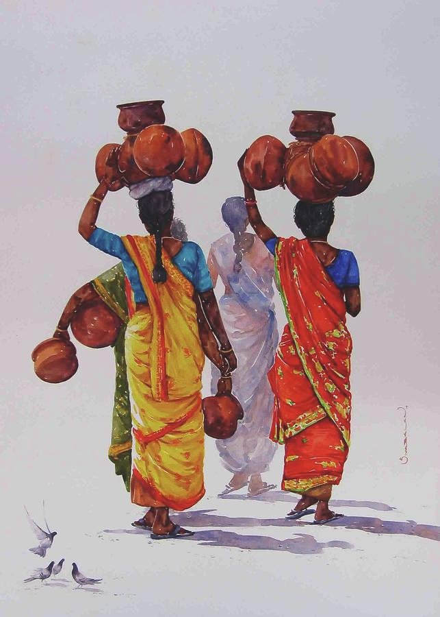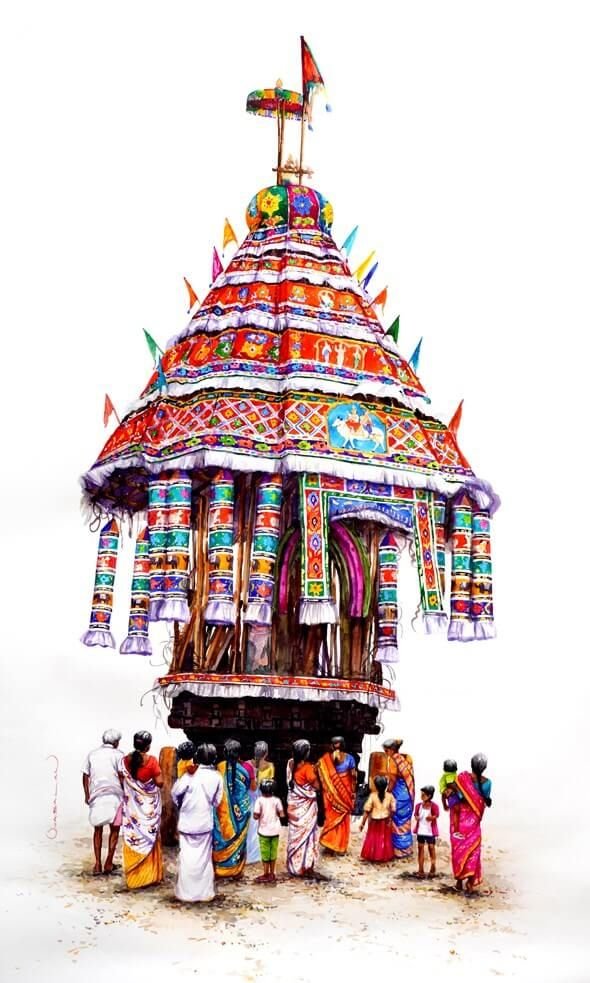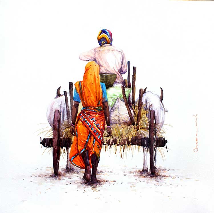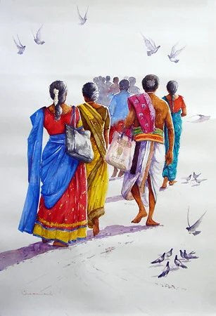 Sivabalan's paintings evoke the essence of nativity and the charm of rural Indian villages—scenes that are increasingly rare in our modern concrete jungles. Hailing from Kumbakonam, a town celebrated for its Chola temples and verdant fields, Sivabalan nurtured a passion for art from an early age. He holds a Master’s Degree in Fine Arts from the Government College of Fine Arts in Kumbakonam, where his artistic journey began to flourish.